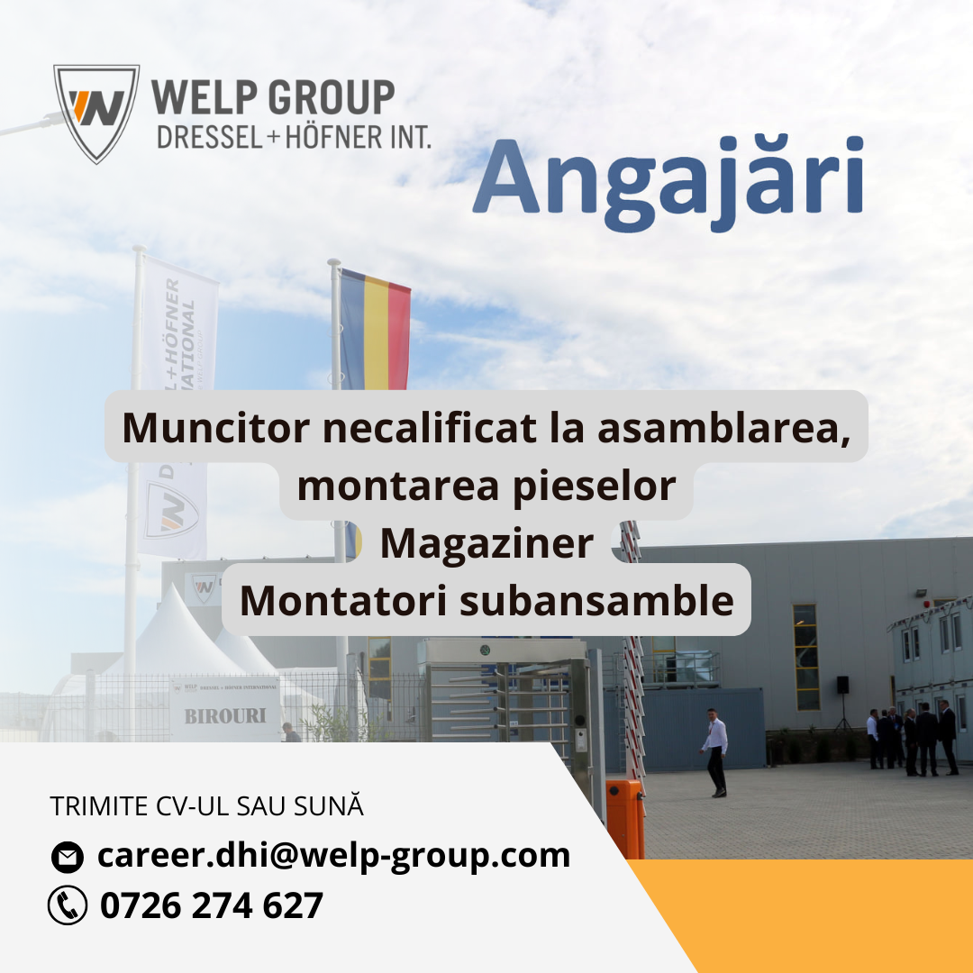 Compania Dressel + Höfner International SRL, parte a grupului WELP, își extinde echipa din Mediaș și angajează personal pentru posturile de Muncitor necalificat la asamblarea, montarea pieselor, magazioner si montator subansamble.